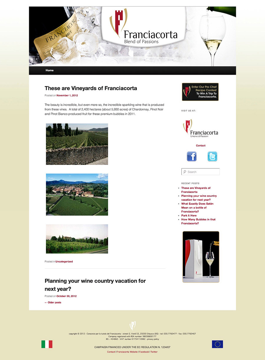 I was hired via Balzac Communications to design a WordPress blog/theme for Franciacorta Wines, as well as their html newsletter, using the their style guides and branding.