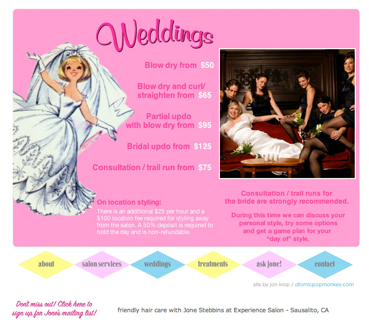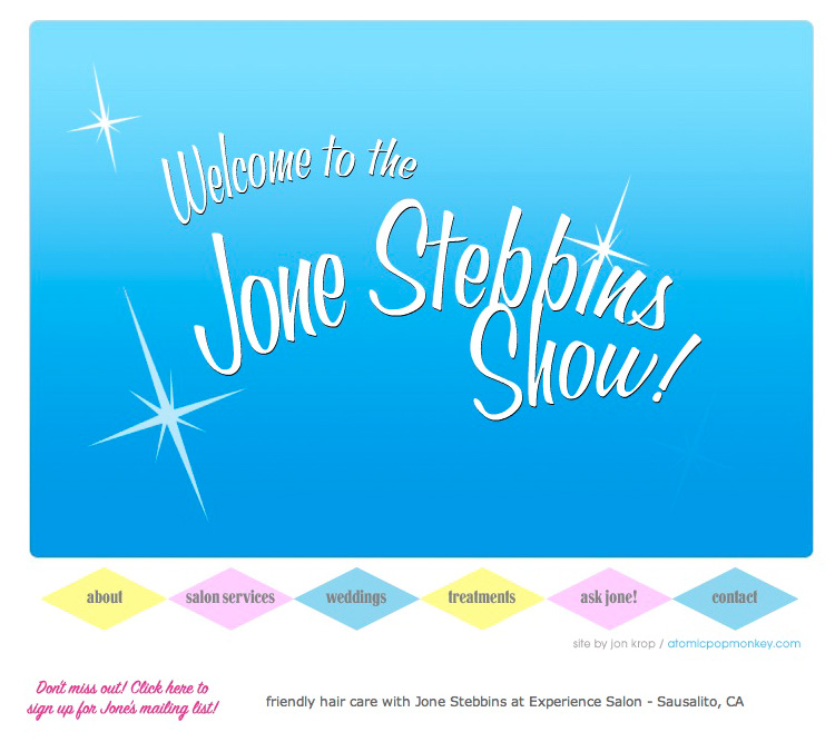 Jone came to me wanting a site for her Sausalito based hair styling business. She wanted something lively, fun, with a retro feel to it. Using html5 based animation, I created an iOS friendly site that captures her fun and friendly personality.